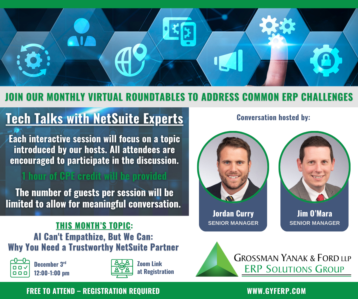 Join the Pittsburgh Area NetSuite Users Group, the GYF ERP Solutions Group & other NetSuite Users. November 6 – 8:30-10:30 am At this virtual meeting, we will discuss a variety of topics, including: SuiteWorld Updates AP/AR Matching New NetSuite Connector – NSIP AI Highlights in NetSuite OutLook Connector Reporting Tips & Tricks – reports […]